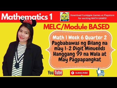 Math 1 Week 6 Quarter 2 Pagbabawas ng Bilang na may 1 2 Digit Minuends Hanggang 99 PLAYLIST GRADE 1 LESSONS SECOND QUARTER PER WEEK Week 1 ALL SUBJECTS https://youtube.com/playlist?list=PLO7WRQitIA5pqqzoSqzQmt-uXIKJYlZ3x Week 2 ALL SUBJECTS https://youtube.com/playlist?list=PLO7WRQitIA5pSSkhJ5Ykwyv8kjiy7UfSy Week 3 ALL SUBJECTS https://youtube.com/playlist?list=PLO7WRQitIA5pJnYnE2ov79sAY9Ze8xQt3 Week 4 ALL SUBJECTS https://youtube.com/playlist?list=PLO7WRQitIA5rL-qgPzKPuELtTVT4PD8q3 Week 5 ALL SUBJECTS https://youtube.com/playlist?list=PLO7WRQitIA5rcOuVgOjOlWhtZdSU1rPbU Week 6 UPDATING https://youtube.com/playlist?list=PLO7WRQitIA5qt_yOiNlD4obBky1f_Gb6V Week 7 UPDATING https://youtube.com/playlist?list=PLO7WRQitIA5o_r9XR_2BgSmqKwKanja7T Week 8 UPDATING https://youtube.com/playlist?list=PLO7WRQitIA5pl7aeOQNR4b3nJF8WsVwQD PLAYLIST GRADE 1 LESSONS FIRST QUARTER PER WEEK WEEK 8 ALL SUBJECTS https://youtube.com/playlist?list=PLO7WRQitIA5pueUoSpzTq3dm5Eu9NkJXo WEEK 7 ALL SUBJECTS https://youtube.com/playlist?list=PLO7WRQitIA5pednDICjXT733MnMX7p1iu WEEK 6 ALL SUBJECTS https://youtube.com/playlist?list=PLO7WRQitIA5qLSAdHNpg5CV-g8uLy5p38 WEEK 5 ALL SUBJECTS https://youtube.com/playlist?list=PLO7WRQitIA5rufzUEbgA4_aKkARSFSWos WEEK 4 ALL SUBJECTS https://youtube.com/playlist?list=PLO7WRQitIA5rc4V0FgJwH2fmwqv6d_i8W WEEK 3 ALL SUBJECTS https://youtube.com/playlist?list=PLO7WRQitIA5q1QB-M3fIGA7YkrPBUPd-n WEEK 2 ALL SUBJECTS https://youtube.com/playlist?list=PLO7WRQitIA5qsBq_rdhu3QexagIg3BfQl WEEK 1 ALL SUBJECTS https://youtube.com/playlist?list=PLO7WRQitIA5rCFv7oE2GmYjf9i3R2EjUe