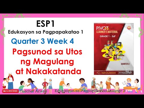 ESP 1 Edukasyon sa Pagpapakatao 1 Week 4 Quarter 3 Pagsunod sa Utos ng Magulang Grade 1 Quarter 1 Lessons per week (COMPLETE) Week 1 https://youtube.com/playlist?list=PLO7WRQitIA5rCFv7oE2GmYjf9i3R2EjUe Week 2 https://youtube.com/playlist?list=PLO7WRQitIA5qsBq_rdhu3QexagIg3BfQl Week 3 https://youtube.com/playlist?list=PLO7WRQitIA5q1QB-M3fIGA7YkrPBUPd-n Week 4 https://youtube.com/playlist?list=PLO7WRQitIA5rc4V0FgJwH2fmwqv6d_i8W Week 5 https://youtube.com/playlist?list=PLO7WRQitIA5rufzUEbgA4_aKkARSFSWos Week 6 https://youtube.com/playlist?list=PLO7WRQitIA5qLSAdHNpg5CV-g8uLy5p38 Week 7 https://youtube.com/playlist?list=PLO7WRQitIA5pednDICjXT733MnMX7p1iu Week 8 https://youtube.com/playlist?list=PLO7WRQitIA5pueUoSpzTq3dm5Eu9NkJXo Grade 1 Quarter 2 Lessons per week (COMPLETE) Week 1 https://youtube.com/playlist?list=PLO7WRQitIA5pqqzoSqzQmt-uXIKJYlZ3x Week 2 https://youtube.com/playlist?list=PLO7WRQitIA5pSSkhJ5Ykwyv8kjiy7UfSy Week 3 https://youtube.com/playlist?list=PLO7WRQitIA5pJnYnE2ov79sAY9Ze8xQt3 Week 4 https://youtube.com/playlist?list=PLO7WRQitIA5rL-qgPzKPuELtTVT4PD8q3 Week 5 https://youtube.com/playlist?list=PLO7WRQitIA5rcOuVgOjOlWhtZdSU1rPbU Week 6 https://youtube.com/playlist?list=PLO7WRQitIA5qt_yOiNlD4obBky1f_Gb6V Week 7 https://youtube.com/playlist?list=PLO7WRQitIA5o_r9XR_2BgSmqKwKanja7T Week 8 https://youtube.com/playlist?list=PLO7WRQitIA5pl7aeOQNR4b3nJF8WsVwQD Grade 1 Quarter 3 Lessons per week Week 1 https://youtube.com/playlist?list=PLO7WRQitIA5pupVol1GDadxFv2GtZ-2-2 Week 2 https://youtube.com/playlist?list=PLO7WRQitIA5q65EHYLFC2-Lga-lvTg9mZ Week 3 https://youtube.com/playlist?list=PLO7WRQitIA5rx2EbK5BXAprTdgGWYCqXQ Week 4 https://youtube.com/playlist?list=PLO7WRQitIA5odZ1o0dtM1Ea6ws-RCEUWo Week 5 https://youtube.com/playlist?list=PLO7WRQitIA5pZZVgfn-8UyvCaJhH2MVkW Week 6 https://youtube.com/playlist?list=PLO7WRQitIA5rm8msBp5x1l80p9Q-Luwwt Week 7 https://youtube.com/playlist?list=PLO7WRQitIA5pksUzAUCBmSR9-2X3SPZhq Week 8 https://youtube.com/playlist?list=PLO7WRQitIA5o70_1KwxEMmlt0G36sEP1Y Grade 1 Quarter 4 Lessons per week Week 1 https://youtube.com/playlist?list=PLO7WRQitIA5obh1lP0RkB1TEXLywwhX_6 Week 2 https://youtube.com/playlist?list=PLO7WRQitIA5pvxU_Cu5GTh1W0BTiqSJdj Week 3 https://youtube.com/playlist?list=PLO7WRQitIA5rVSq3rQ5Xrn-Ynud3bOfEz Week 4 https://youtube.com/playlist?list=PLO7WRQitIA5p0wUn1bV4o1auEa80msFNV Week 5 https://youtube.com/playlist?list=PLO7WRQitIA5plBF0Nqa3ka2GZ4Gf7dTVE Week 6 httpsp://youtube.com/playlist?list=PLO7WRQitIA5pmOoyU9vgcImIynSKe9MWR Week 7 Week 8 https://youtube.com/playlist?list=PLO7WRQitIA5rgRuA7y9wOxr7hOWBCUl9N