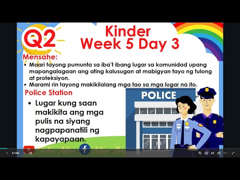 Kinder Matatag Week 5 Day 3 Quarter 2 Barong Barong Akda ni Emily S Respicio A. Pamantayang Pangnilalaman The learners understand the value of discipline, honesty, respect, friendship, and care and concern. B. Pamantayang Pagganap The learners demonstrate proper discipline, honesty, respect, friendship, and care towards other people. C. Mga Kasanayang Pampagkatuto ● Follow rules and regulations in going to different places ● Demonstrate proper ways of caring and protecting one’s community ● Identify familiar sounds in the environment ● Describe the different places and persons belonging in one’s community ● Recognize different modes of transportation on land, water, and air used in the community ● Identify the positions (in, on, under, top, and bottom) and directions (left and right, front and back) of object in one’s environment ● Demonstrate proper behavior in various situations and places in the community D. Mga Layunin (Mensahe) ● Nalalaman ng bata na mayroong mga lugar sa komunidad na maaring puntahan para sa mga pangangailangan niya at ng kaniyang pamilya. ● Natutukoy ng bata kung sino ang kailangan puntahan sa komunidad ayon sa pangangailangan. ● Natututuhan ng bata kung ano-ano ang mga puwede niyang makita sa iba’t ibang lugar sa kaniyang komunidad. E. Nilalaman/Paksa Mayroong mga lugar na maaaring pagkunan ng serbisyong pangkalusugan, kaligtasan, at proteksiyon (klinika, ospital, mga health center, istasyon ng pulis, istasyon ng bombero, kampo ng mga militar). Mga Mensahe Maari tayong pumunta sa iba’t ibang lugar sa komunidad upang mapangalagaan ang ating kalusugan at mabigyan tayo ng tulong at proteksiyon. Marami rin tayong makikilalang mga tao sa mga lugar na ito. Mga Katanungan Saan tayo pumupunta kapag tayo ay may sakit? Sino-sino ang pwede nating puntahan upang magpagamot? Saan tayo pumupunta kapag masakit ang ating ngipin? Sino-sino ang pwede nating puntahan upang magpagamot? Saan tayo pumupunta kapag tayo ay nasa panganib? Sino-sino ang pwede nating puntahan upang tayo ay mailigtas? Saan tayo tumatawag kapag mayroong sunog sa atin? Sino-sino ang pwede nating puntahan upang makatulong sa panahon ng sunog? Sino-sino ang mga nagtatrabaho sa ating komunidad na pwedeng tumulong at m